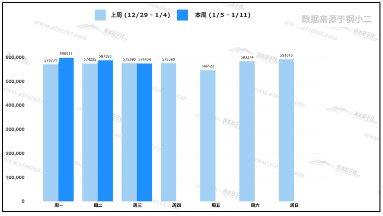 據(jù)鋼小二平臺樣本數(shù)據(jù),1月7日建筑鋼材社會庫存量為574,434噸,較前一交易日庫存下降2.2%。