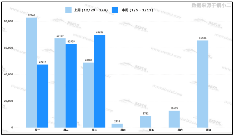 據(jù)鋼小二平臺樣本數(shù)據(jù),1月7日采樣全國工程需求量為69,656噸,較上一交易日上漲10.7%。