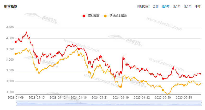 本期,全國(guó)多數(shù)市場(chǎng)建筑鋼材價(jià)格區(qū)間波動(dòng):其中,北方需求較弱,小幅震蕩;南方期貨引領(lǐng),頻繁上下。本周西本鋼材指數(shù)微調(diào),成本指數(shù)回漲,顯示長(zhǎng)流程鋼廠即時(shí)利潤(rùn)空間難以提升;本周螺紋鋼期貨主力合約拉高調(diào)整,對(duì)現(xiàn)貨有引導(dǎo)作用。(下圖為紅色線條為鋼材指數(shù),黃色線條為成本指數(shù))