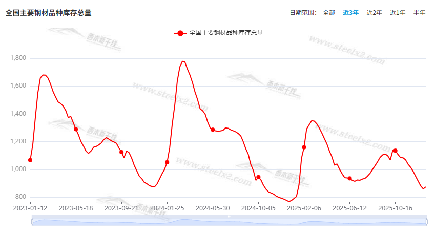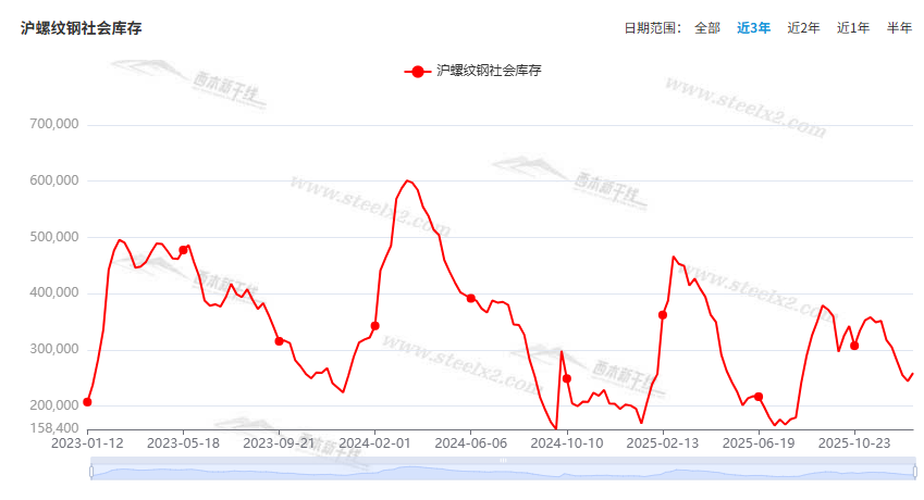 中鋼協(xié)統(tǒng)計(jì)數(shù)據(jù)顯示,2025年12月下旬重點(diǎn)鋼企生鐵日均產(chǎn)量167.0萬噸,旬環(huán)比下降0.6%,同比下降3.7%;粗鋼日均產(chǎn)量164.3萬噸,旬環(huán)比下降11.0%,同比下降12.3%;鋼材日均產(chǎn)量189.2萬噸,旬環(huán)比上升4.9%,同比下降4.3%。2025年12月下旬重點(diǎn)鋼鐵企業(yè)鋼材庫(kù)存量為1414萬噸,旬環(huán)比減少187萬噸,下降11.7%;比上月同旬減少14萬噸,下降1.0%;比去年同旬增加177萬噸,上升14.3%。