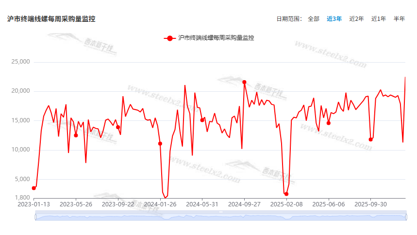 本期,西本資訊監(jiān)測(cè)的滬市線螺周終端采購(gòu)量為2.25萬噸,周環(huán)比增加99.12%(見下圖)。本周終端需求環(huán)比大增,主要原因是本周有六個(gè)工作日,而前一周只有三個(gè),如果換算到單日,則變化不大。